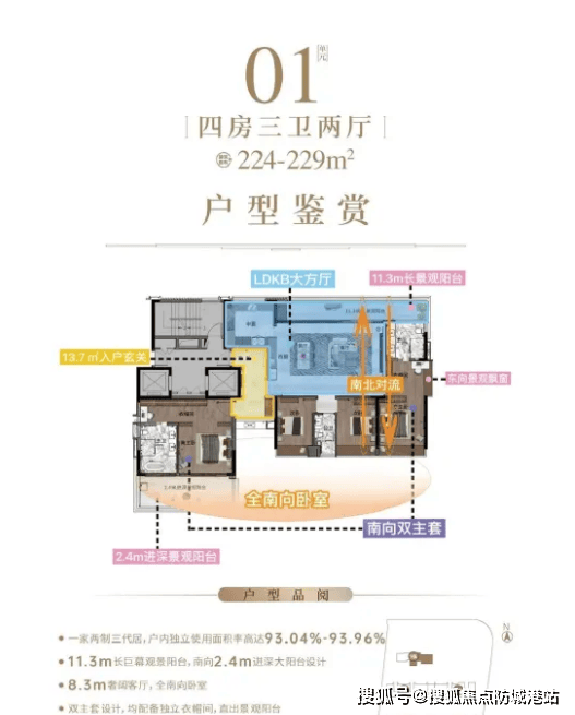 224-229㎡四房户型定位高端改善,同样采用2梯2户板式设计,3.3米顶豪级层高,让室内空间更显阔绰气派。即便装上中央空调或后期加装地暖,纵向空间依旧绰绰有余,同时能提升室内采光与视野,让房间更加明亮通透。户型采用大面宽设计,客厅宽敞明亮,搭配南向望江阳台,推窗即可欣赏江景与园林景观,尽显豪宅质感。