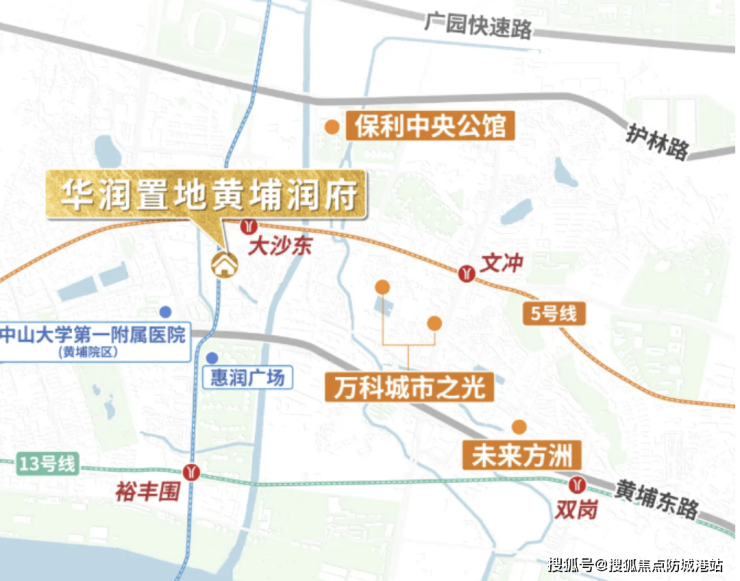 润府项目位于大沙东地铁站附近,紧邻广州地铁5号线与7号线换乘站,形成了极为便利的轨道交通枢纽。5号线直达珠江新城、金融城等广州核心商务区,而7号线则通达科学城和长隆万博,串联南北东西重要经济带。此外,项目临近黄埔大道及正在建设的鱼珠隧道,未来将极大提升通达性,快速连接珠江新城、金融城和琶洲核心区。规划中的黄埔高铁站进一步赋予该区域快速接轨大湾区内城市群的潜力,交通便利性显著提升。项目地处老黄埔旧中心地段,商业和公共设施较为完善,交通和生活配套均具备较强竞争力。