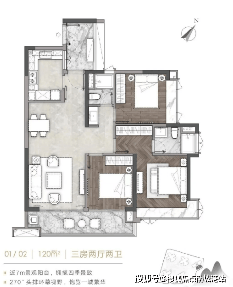 A1-01/02户型:建筑面积约120㎡,三房两厅两卫