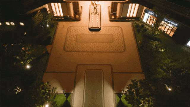 走进项目,首先映入眼帘的并非简单的门楼,而是经过艺术化处理的归家仪式场域。门前搭配的艺术雕塑与光影排布,结合水景设计,营造出一种兼具现代感与秩序感的视觉冲击。这种对公区界面的投入,反映了开发商在建筑规划理念上对“面子”与“里子”的双重重视。在建筑风格上,项目摒弃了繁复的装饰,转而追求线条的利落与材质的质感,外立面设计简洁大气,能够很好地融入黄埔城芯的现代城市界面。整个社区采用围合式布局,6栋47层高的塔楼沿地块边缘排列,这种设计最大化地释放了中央空间,为内部园林的营造留出了充足的余地。围合式布局的另一大优势在于形成了内向型的静谧环境,有效隔绝了外部主干道的噪音干扰,让高层住户在俯瞰城市繁华的同时,也能在社区内部找到一片安宁。