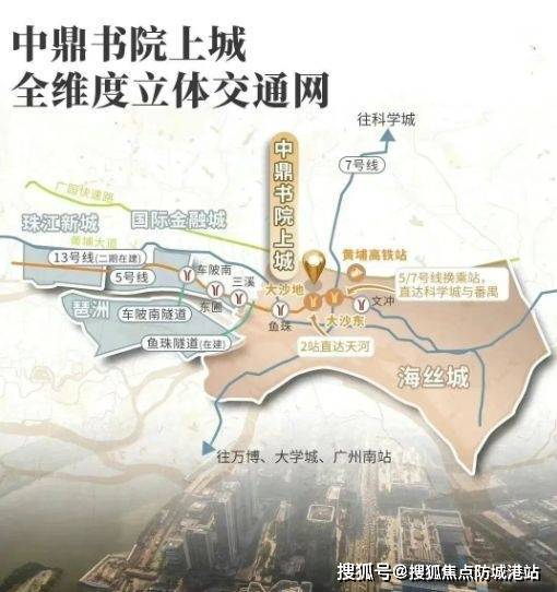 交通上,步行约600米即达5号线大沙地站,2站到三溪,无换乘直达金融城、珠江新城;自驾通过黄埔大道、广园快速,20分钟通达天河核心区。周边大沙地、文冲、三溪三大成熟商圈环绕,山姆、宜家、美林天地等高端商业触手可及。