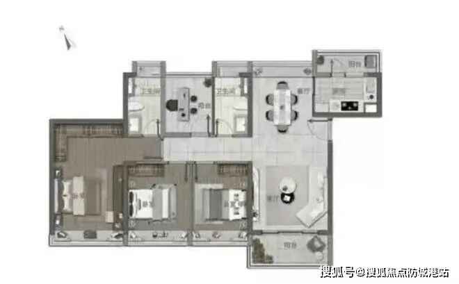 建面约117㎡户型,在空间尺度上进一步提升,完美适配三口之家或四口之家的居住需求。客厅更为宽敞明亮,无论是家人闲坐聊天,还是邀请朋友聚会,都能从容应对;各个功能区域划分清晰,厨房、餐厅、客厅动线流畅,烹饪、用餐、休闲互不干扰。同样的板式设计,让每一个房间都能享受到充足的采光与良好的通风,卧室空间舒展,搭配观景飘窗,让孩子在自然的陪伴下成长,让家人在舒适的环境中休憩。