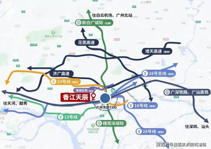 更令人期待的是,规划中的广州地铁28号线(佛山经广州至东莞城际)将在陈家林路设站,距离项目仅约900米。该线路作为湾区东西向快线,未来将串联起佛山、广州中心区、黄埔、增城乃至东莞,实现“轨道上的大湾区”高效互联。届时,香江天辰业主可轻松畅达天河、海珠、黄埔等核心板块,真正融入广佛莞1小时生活圈。