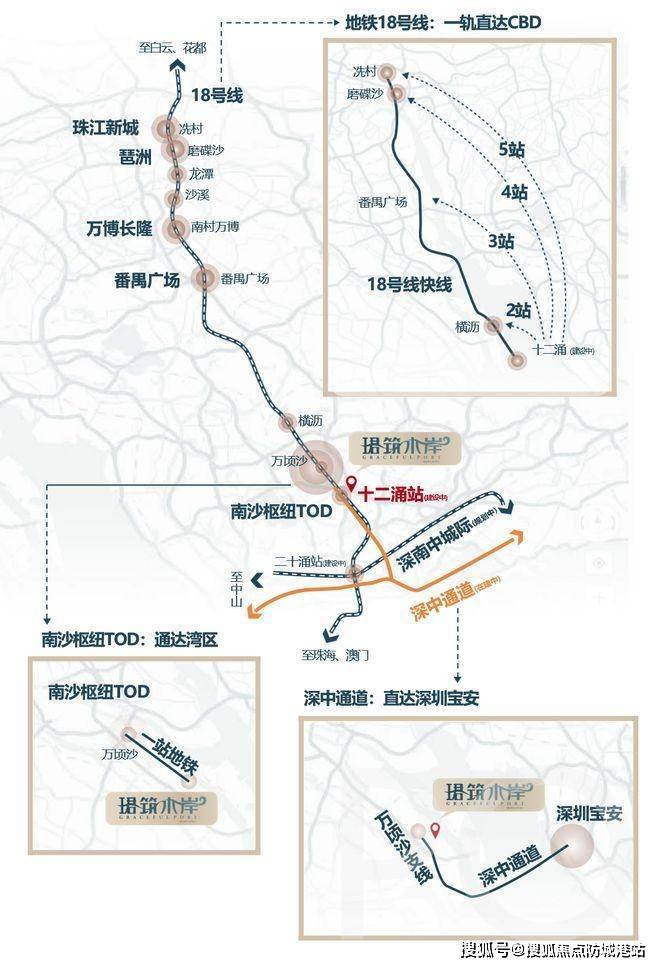 珺筑水岸地理位置得天独厚,距离深中通道广州出入口约 2 公里,这一关键交通节点使得项目能够快速联通深圳前海,尽享大湾区核心区域的发展红利。值得一提的是,其房价仅约为前海的六分之一,却能实现便捷通达,性价比极高。同时,项目距离广州地铁 18 号线十二涌站约 1.2 公里(建设中,广州段预计 2025 年开通)。这条被誉为全球最快的高速地铁,设计时速达 160km/h,作为湾区首条此类地下轨道交通,意义非凡。快线模式下,2 站可达番禺广场,5 站直通珠江新城 CBD,更可接驳中山、珠海等地,为居民提供了高效便捷的城际交通网络,坐享广深中珠四地城际交通核心优势,轻松畅行大湾区。
