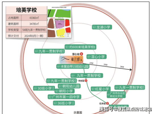 在中小学教育方面,项目周边2公里范围内设有两所九年制中小学,满足不同年龄段学生的教育需求。最受关注的是板块内的54班九年一贯制公立培英学校,该校为广州市培英中学科技城校区,由培英中学统一安排管理团队及优质师资进驻,办学实力雄厚。学校将于2025年8月正式移交给教育局,同年9月全面开学,小学一年级计划招生2个班,初中一年级计划招生4个班。