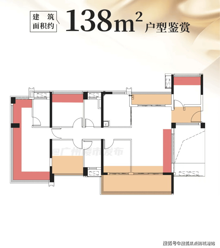 3. 建面约138㎡双套房+四开间朝南五房:作为项目的改善标杆户型,该户型配备双主卧套房设计,均带有独立卫浴与观景飘窗,保障家庭成员的私密性与舒适度。客厅采用大方厅设计,连接7.2米景观阳台,空间通透大气,同时设置独立家政间,提升居住便利性。实测使用面积165㎡,实用率119%,满足多人口家庭的居住需求,是南沙区府板块改善户型的首选。