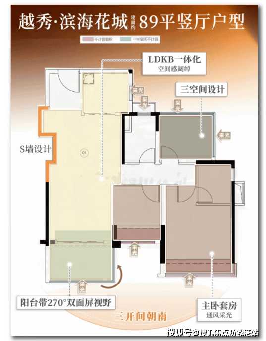 在产品力方面,越秀滨海花城的新组团堪称“卷王”。借助最新的建筑设计规范,项目推出了使用率高达115%的户型产品,这在市场上极具竞争力。新组团主推建面约76至127平方米的三至四房,每一寸空间都被压榨到了极致。以约89平方米的户型为例,竟然做到了三个房间均拥有270°的环幕视野,且配备了主套,这在传统设计中是不可想象的。