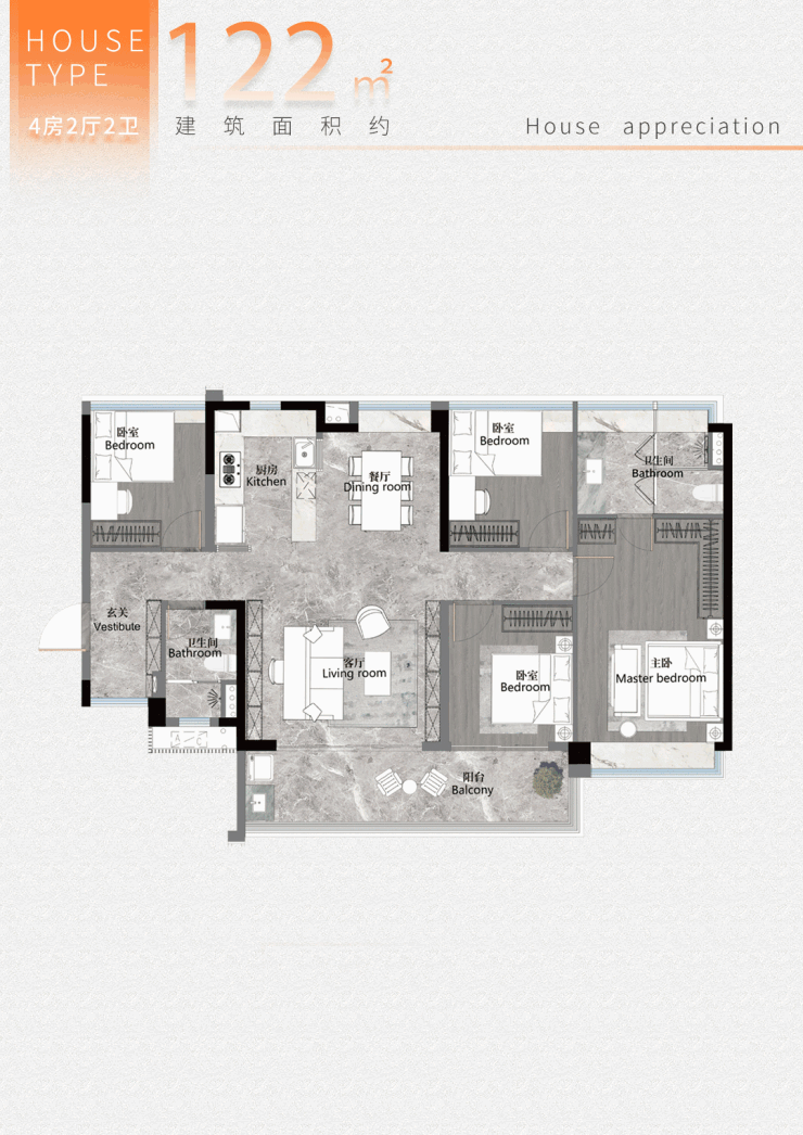 ● 一期在售户型:建面约122-186平南向阔景四房,得房率约100-110%,均为全南向设计,搭配超大面宽+巨幕阳台,实现南北对流,主卧为大主套设计,配备独立卫生间、衣帽间,空间尺度充足。