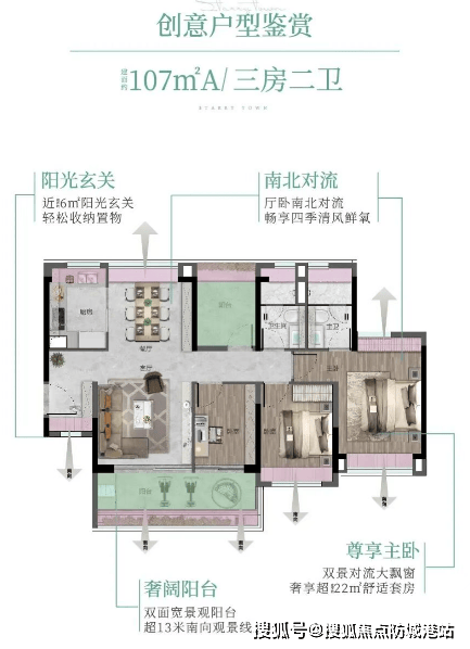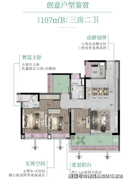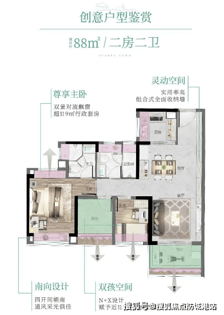 88㎡ 3空间2厅2卫:罕见四面宽小户型,三卧室朝南,超11米景观线,精细化收纳设计。