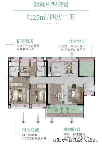 125㎡ 5空间2厅2卫:4.5开间朝南,客餐厅南北对流,舒适阳光宅,双面宽观景阳台,实用率超高。