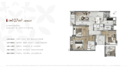 107㎡四空间两厅两卫:大面积户型,适合追求豪华居住体验的家庭。客厅与餐厅相连,形成了一个开放式的公共活动区。