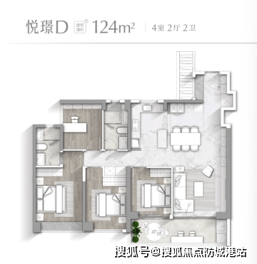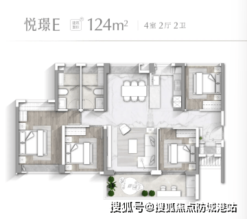 124㎡三房(悦璟系列):空间开阔,三南向卧室+约6.5-6.7米双面宽阳台,主卧套房带独立梳妆台,适合二孩过渡改善。