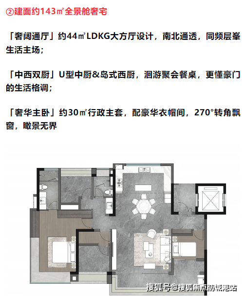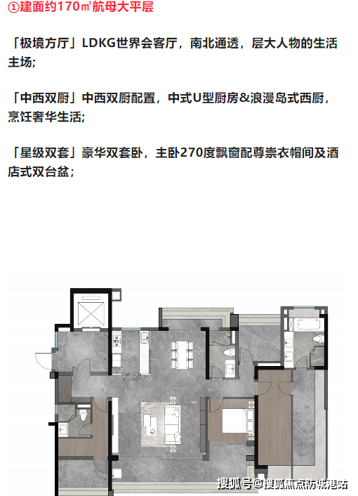 项目的户型为建面约 107-170㎡的全景舱板奢大平层,新规户型使用率高达 115%。以建面约 170㎡的航母大平层为例,采用了 LDKG 世界会客厅设计,南北通透,打造出层大人物的生活主场;中西双厨配置,中式 U 型厨房与浪漫岛式西厨相结合,满足不同烹饪需求;豪华双套卧,主卧 270 度飘窗配尊崇衣帽间及酒店式双台盆,尽显奢华。建面约 143㎡的全景舱奢宅,约 44㎡的 LDKG 大方厅设计,同频层峯生活主场;约 30㎡的行政主套,配豪华衣帽间和 270° 转角飘窗,瞰景无界。建面约 107㎡的全景会所奢宅,四开间朝南,约 11.8 米面宽,纵享豪宅尺度;LDKB+X 通透宽厅,联动约 5.9 米景观阳台,空间布局灵活。