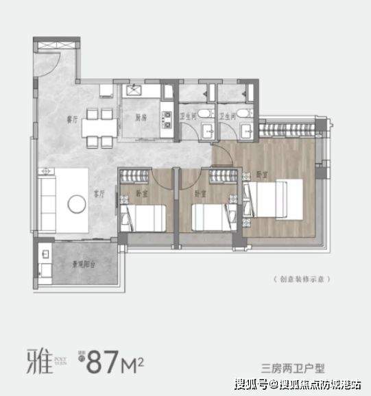 约87㎡三房两卫 ≈ 广钢约111-118㎡旧规三房;