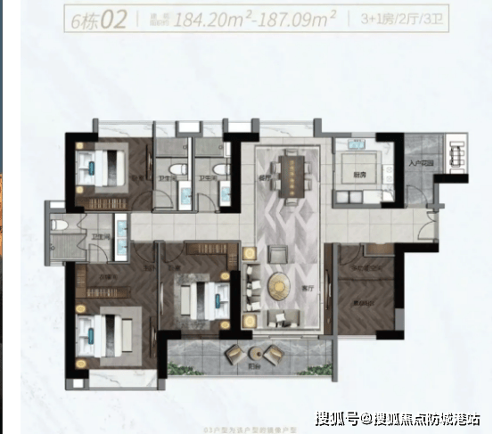 143㎡四房两厅三卫户型,是改善家庭的优选户型。户型采用南北双阳台设计,南向阳台用于休闲观景,北向阳台用于生活晾晒,功能分区明确;四房设计满足多孩家庭或三代同堂的居住需求,每个房间都配备充足的采光面,确保居住舒适度;主卧为套间设计,配备独立卫生间、衣帽间与大飘窗,彰显尊贵品质;书房空间独立,可满足居家办公、学习的需求。该户型空间开阔,布局合理,能够为改善家庭提供舒适的居住体验。