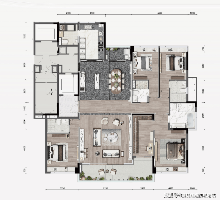 项目主打大平层设计,户型面积从200至350平方米不等,所有单元均采用三梯两户设计,层高达到3.5米,部分户型还配备了专属工人电梯及超大观景阳台。室内装修选用国际一线品牌材料,不仅体现了豪华品质,更彰显了居住者的品味与身份。