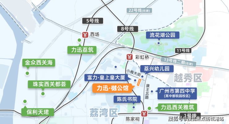 力迅樾公馆拥有极为优越的地铁出行条件,500 米范围内即享双地铁覆盖:步行 5 分钟可达地铁 1 号线 / 8 号线陈家祠站,步行 8 分钟可达地铁 8 号线 / 11 号线 / 13 号线 / 22 号线彩虹桥站(在建)。其中,陈家祠站已投入使用,1 号线可直达体育西路、珠江新城等核心商圈,8 号线串联琶洲、白云新城等重要板块;彩虹桥站作为广州地铁 “超级换乘枢纽”,未来将实现四线交汇,11 号线作为环线贯通天河、海珠、白云、荔湾四大核心区,13 号线二期直达珠江新城,极大提升了项目通达全城的效率。