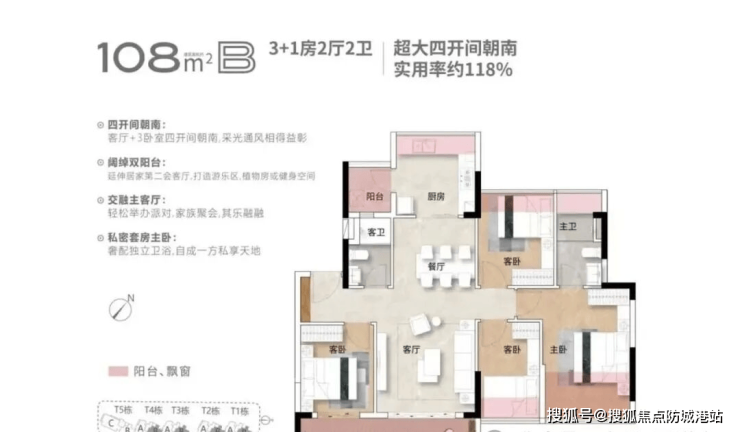 98㎡四房两厅两卫:该户型是项目的爆款户型,实测得房率 111%,套内面积 108.8㎡。户型采用三开间朝南设计,客厅面宽 3.8 米,连接南向景观阳台,采光通风极佳;主卧为套房设计,配备独立卫生间和衣帽间,保证业主的私密性;厨房采用 U 型设计,操作空间充足,连接北向生活阳台,方便日常晾晒和储物;四个房间布局合理,可满足二胎家庭或三代同堂的居住需求,部分房间可灵活改造为书房、儿童房等,实用性极强。