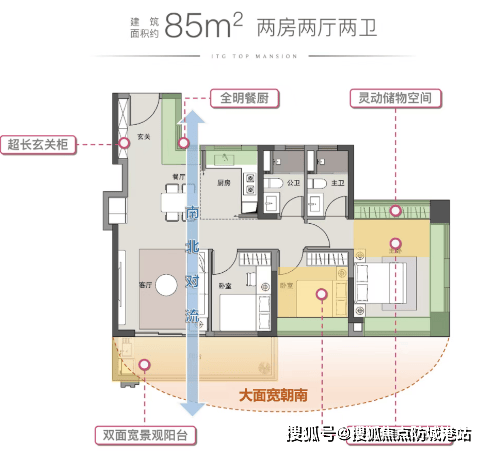 85 平三房:玄关一侧带 L 型飘窗,四开间朝南,三卧室均朝南,主卧三面采光三面飘窗,可灵活改造,空间利用最大化。