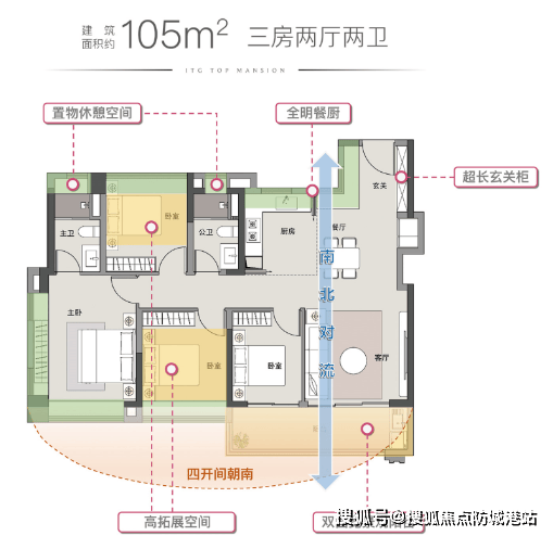 105 平四房:四开间朝南,阳台连通客厅与次卧,布局合理,满足家庭多样化需求。