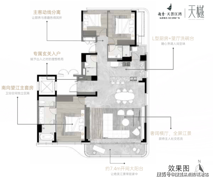 项目户型由全球知名设计团队精心打造,注重空间布局与景观最大化。天樾组团主推户型包括293㎡的天樾、237㎡的天穹、202㎡的天宸和176㎡的天玺,每一户都实现专梯入户,保证私密性。天樾户型LDKB一体化设计,约66㎡江景会客厅,270°全景望江,奢阔阳台延伸7.2米,让江景融入生活。天穹、天宸及天玺户型均采用宽厅大阳台设计,配备U型或L型厨房,兼顾烹饪舒适与社交互动,奢阔卧室套房保证私密性。整体户型体现了高端豪宅的尊贵体验和空间实用性。
