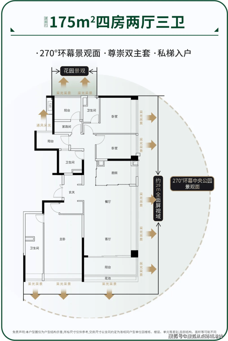 【175㎡四室两厅三卫】总价约735万元/套,为项目高端改善户型,主打南向布局,卧室全部朝南,享受充足阳光与通风。户型配备入户花园,营造尊崇归家仪式感,同时可作为玄关收纳或休闲区域。主卧套房设计,配备独立卫浴、衣帽间与飘窗,尽显高端品质;公共卫生间干湿分离,提升使用便利性。大面宽阳台与全玻璃幕墙搭配,可俯瞰90万㎡中央公园景观,实现与自然的无界共生。