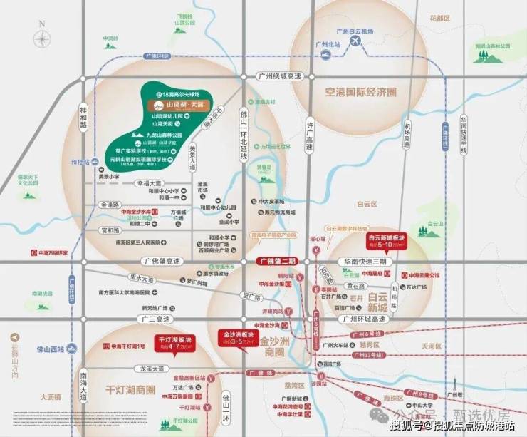 🚙交通优势:(1)三横三纵一城轨三横:广州绕城高速,广佛肇高速(接驳华快三期)、广三高速(接驳环城高速)三纵:许广高速、佛山一环、桂和路一轨:广佛轨道大工程-广佛环线西段(规划中) (2)通往白云20分钟、天河 40分钟项目沿中信大道上佛山一环可以快速接驳广佛肇高速,避开现有塞车段直达白云石井,去到滘心地铁站8号线,以及朝阳地铁站。转黄石路可达白云新城商圈、百信广场、白云万达一带,如果直接接驳华快更是可通达天河北商圈。 (3)通往白云机场 25分钟与空港经济圈和白云机场直线距离14km,沿佛山一环往北经广州绕城高速可达 (4)通往千灯湖30分钟、大沥 25分钟项目经佛山一环,或者桂和路往南行可通往大沥和千灯湖商圈。 (5)城际轨线 广佛环线西段规划在幸福大道的隧道位置设里水站,未来出行将更加便捷。 (6)公交总站 小区里开通了里05、222公交路线,还有直达金沙洲浔峰岗地铁站的接驳巴士。