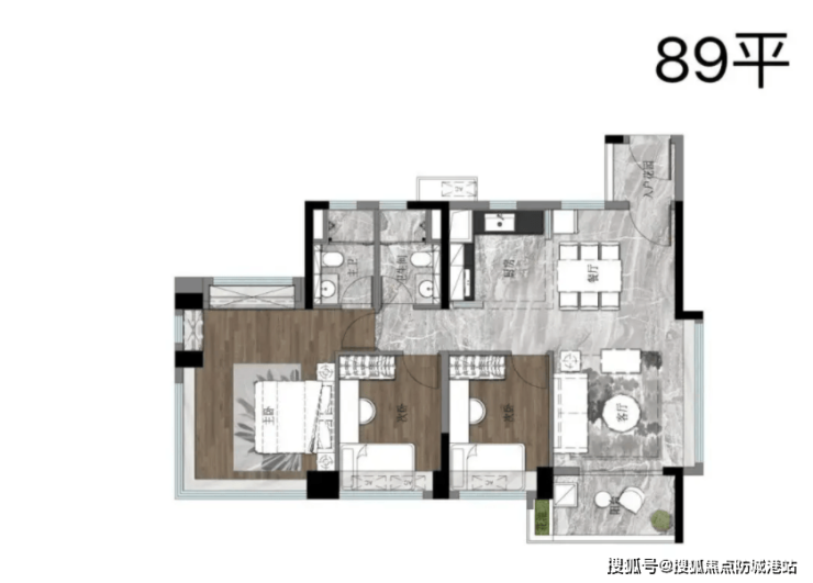 81-89㎡三房两卫:得房率高,功能完善,是市场主流选择。