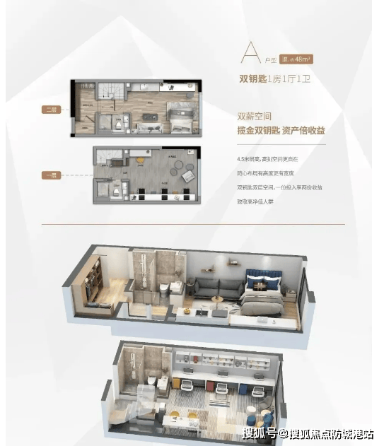 建面约50㎡户型是项目最受欢迎的户型之一,4.5米阔绰客厅,每层拥有1房1厅1卫的布局,空间利用率极高,可满足小两口自住需求。该户型部分为双钥匙设计,可分租两户,实现资产双倍收益,是投资客的首选户型,租金回报率可观,同时总价适中,购房压力相对较小。