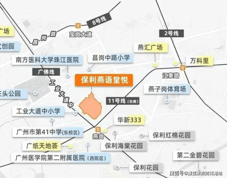 交通是燕语堂悦的核心优势之一。项目距广佛线与11号线(预计2025年通车)换乘站——燕岗站仅约100米,真正实现“地铁上盖”。11号线作为广州首条市区大环线,被誉为“换乘之王”,未来可4站达上涌、8站抵琶洲,无缝链接珠江新城、金融城等核心CBD。自驾方面,紧邻工业大道主干道,向北接内环路,向南5分钟接入新滘西路与环城高速;在建的环岛路更将实现22分钟直达珠江新城。周边500米内设13个公交站点、28条线路,公共交通极为发达。对于在琶洲、珠城或广佛交界工作的上班族而言,这种“轨道+高速+公交”立体路网,意味着每日可多睡十分钟,显著提升通勤幸福感。