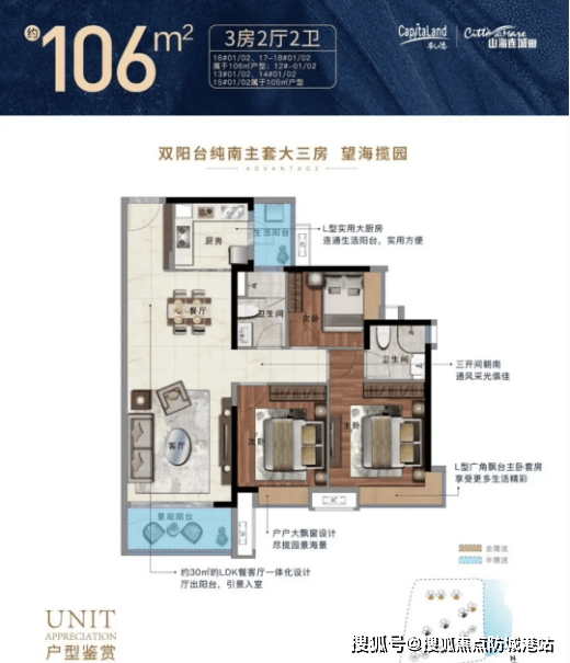 91㎡、106㎡三房两厅两卫户型,在85㎡户型基础上升级优化,增加一个卫生间,更适合人口较多的家庭。91㎡户型布局方正,动静分区明确,客厅与餐厅相连,拓展活动空间;主卧配备独立卫生间,保障隐私性;阳台视野开阔,部分户型可享受海景资源。106㎡户型空间更宽敞,客厅面宽更大,采光效果更佳,次卧尺寸充足,可作为儿童房或书房,满足家庭多元化需求。