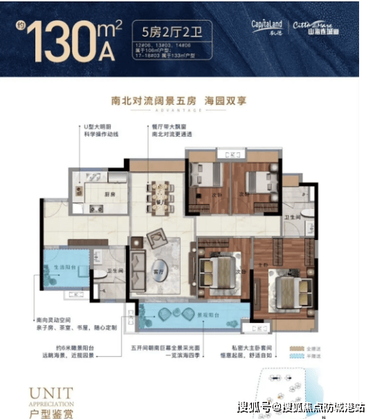 130㎡户型分为A、B两种户型,其中A户型为五房两厅两卫,B户型为四房两厅两卫。130㎡A户型是板块内稀缺的五房产品,空间宽敞通透,适合改善型及多孩家庭;户型布局合理,动静分区清晰,客厅连接超大阳台,海景视野极佳;五个房间可灵活规划,满足居住、办公、储物等多种需求,精装交付标准高,细节打磨到位。130㎡B户型及135㎡四房两厅两卫户型,空间舒适大气,主卧套间设计,配备衣帽间与独立卫生间,提升居住品质;客厅与餐厅通透相连,搭配大阳台,采光通风俱佳,部分户型享270°无遮挡海景。