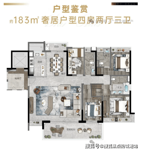 约183㎡环幕大宅: 大方厅/中西厨岛台设计/双主套设计,空间尺度奢阔,配备约8.3米南向观景阳台,提供270°一线广角山景视野。