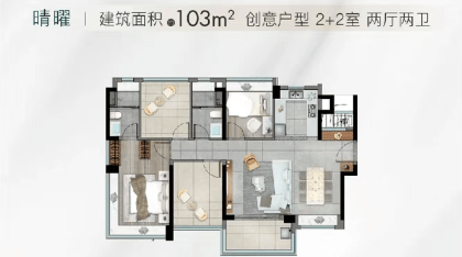 103㎡四房:横厅设计,6.1米景观阳台,主卧270°转角飘窗+独立衣帽间。