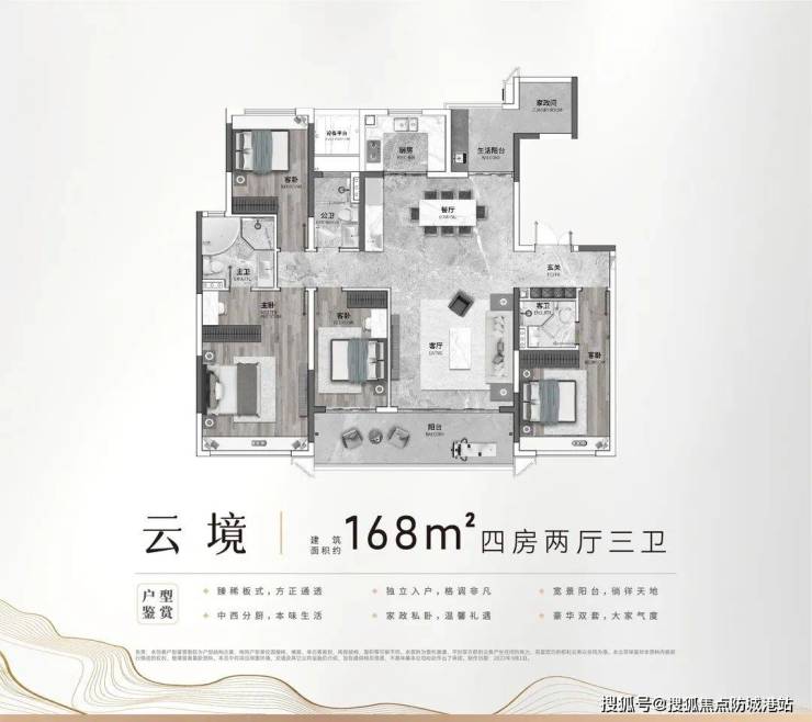 168㎡纯改善四房:板式大平层,专梯入户,超宽阳台一览无余的山景风光,中西厨设计,满足尊贵需求。