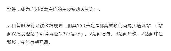 交通方面,项目150米到城轨站。1站即达长隆站,可换乘地铁3和7号线,2站到万博、30分钟到珠江新城。