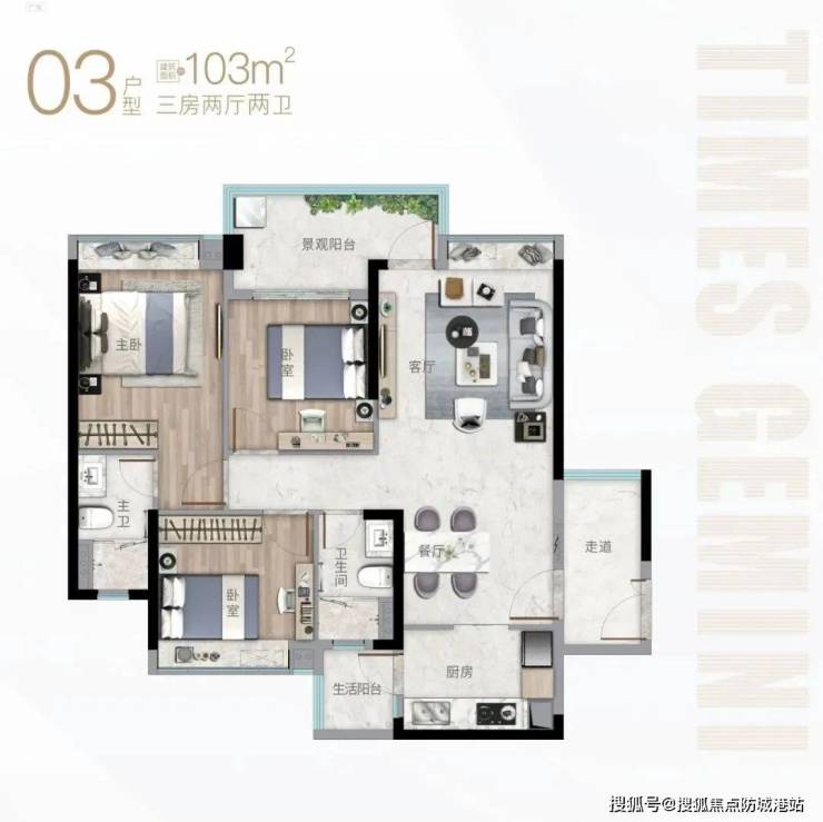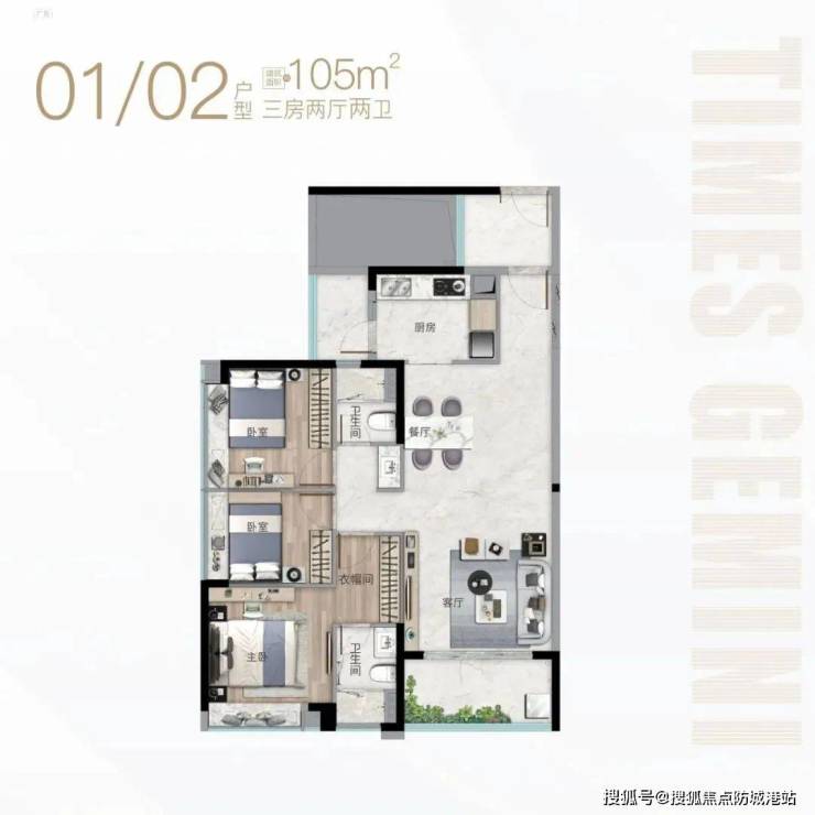 产品方面,时代珑星共两栋楼,分别是G1栋和G2栋。从外形上看,G1栋算正常,蝶形设计,两梯六户,户型为99-106平三房;G2栋外观略显独特,G2栋推出的面积段为62-79㎡精奢小户住宅。