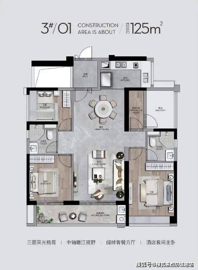约125㎡四房两厅两卫:经典竖厅布局,动静分区明确;双次卧+多功能房灵活组合,适合多孩家庭或居家办公需求;超大观景阳台,将滨江风光尽收眼底。