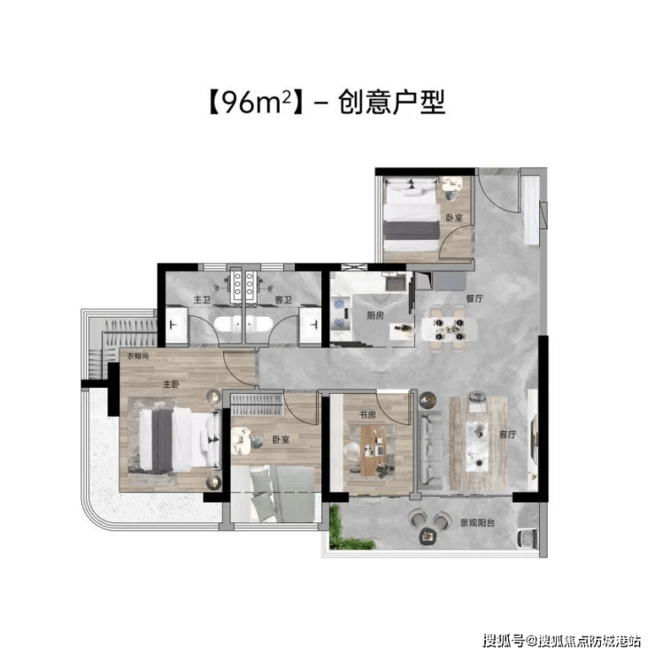 96㎡户型最大的亮点在于拥有5.7米宽的阳台,部分户型可直接看到山景,视野开阔。户型采用四开间朝南设计,客餐厨一体化布局,让室内空间更加通透流畅,采光和通风效果极佳。主卧同样配备270°飘窗,且可欣赏山景,让业主在日常生活中就能与自然亲密接触。该户型适合对居住视野和舒适度有一定要求的刚改家庭。