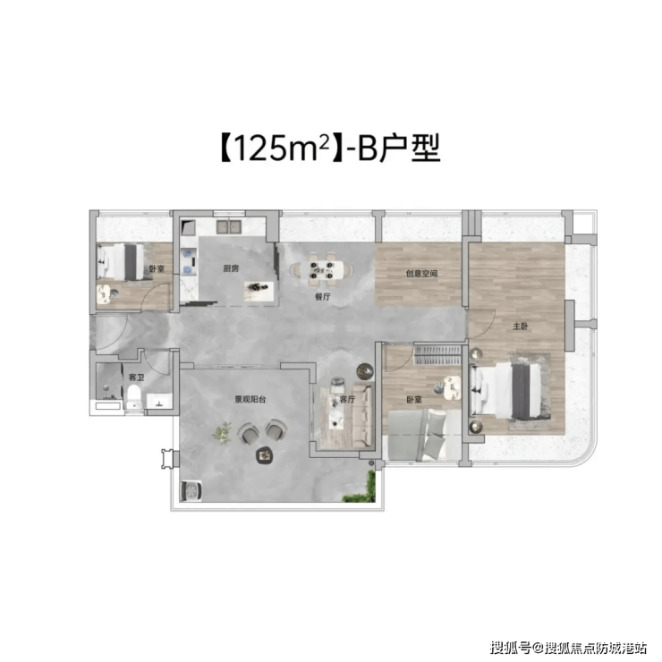 80㎡户型作为项目的刚需主力户型,采用东南朝向设计,四开间朝南,保证了充足的采光和通风。主卧配备270°弧形飘窗,不仅拓展了室内空间视野,还能让业主在房间内就能欣赏到窗外美景。虽然户型面积不大,但空间布局合理,动静分区清晰,三房两厅两卫的设计能够完美满足小家庭的居住需求,无论是新婚夫妻,还是三口之家,都能住得舒适自在。