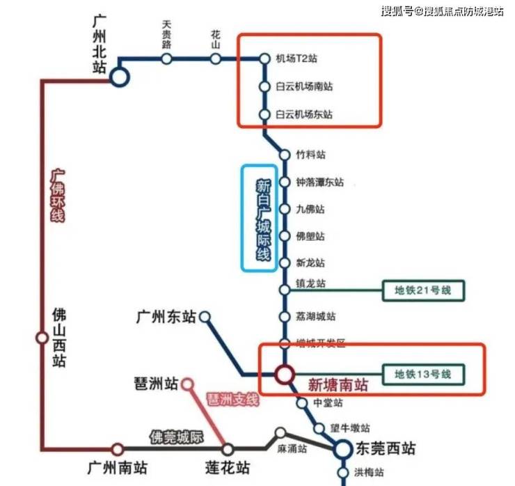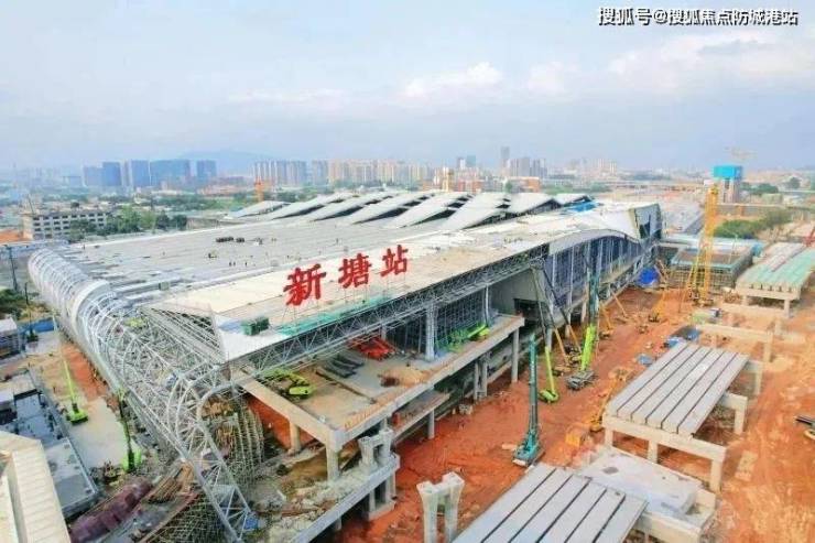广州东部交通枢纽中心(新塘站)于2019年6月30日开工建设,正线全长约203公里,设计时速350公里,引入2条国铁(广深铁路、广汕铁路)、3条城际快线【穗深城际——已通车,30分钟畅达香港、深圳;新白广城际——2023年年内通车,(规划中)佛山经广州至东莞城际】。