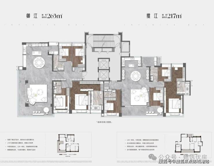 五矿万境水岸 I 半岛:【御江】263㎡四房三卫双套房专梯专户,私享专属电梯厅,附带超大专属面积;约5.8米超宽客厅开间,客厅270°落地玻璃包围;超17米转角L型阳台,270°广角视野俯瞰桂畔海江景;LDKB客餐厨一体化设计,配置独立西式岛台。