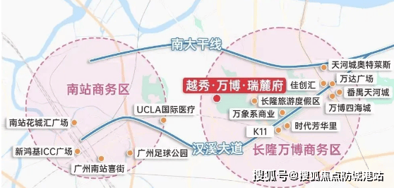 越秀・万博・瑞麓府坐落于长隆动物世界西南侧,西侧紧邻钟顺路,处于长隆万博 CBD 的核心辐射区。2025 年,万博正式扩容为长隆万博 CBD,规划面积从原来的 1.5 平方公里扩大至 7.2 平方公里,规模赶超 6.19 平方公里的珠江新城,形成 “北天河南番禺” 的双中心格局,成为广州新的 “宇宙中心”。
