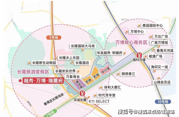 项目距离万博 CBD 核心区域仅约 5 公里,开车 10 分钟即可抵达,业主可便捷享受 CBD 内的高端商业、总部办公等资源。同时,项目紧邻长隆文旅板块,左手执掌文旅顶流资源,右手拥抱总部 CBD 配套,实现了繁华与自然的完美融合。