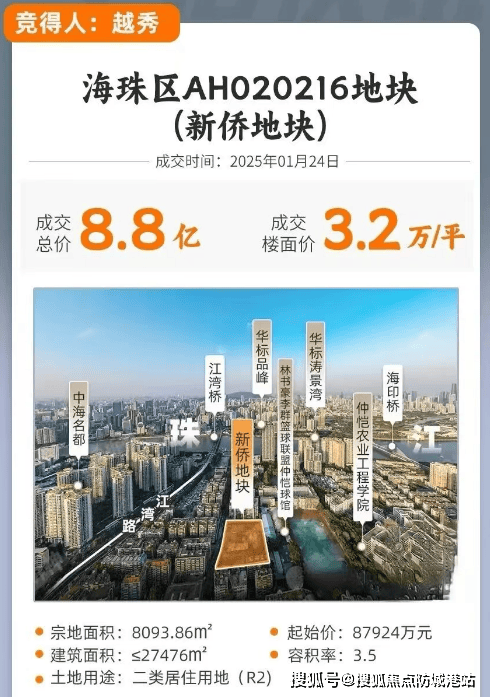 2025年1月24日,广州市迎来了当年首宗宅地拍卖——海珠滨江中AH020216地块,也被称为江湾路以西的新侨地块。该地块由越秀地产以底价近8.8亿元、楼面价3.2万元/㎡的价格拿下。与越秀江湾潮起、越秀桂悦东晓等项目一样,新侨地块以其“小而精”的特点吸引了广泛关注。作为滨江中板块多年来的首次新供应,该项目无疑为周边带来了新的活力。