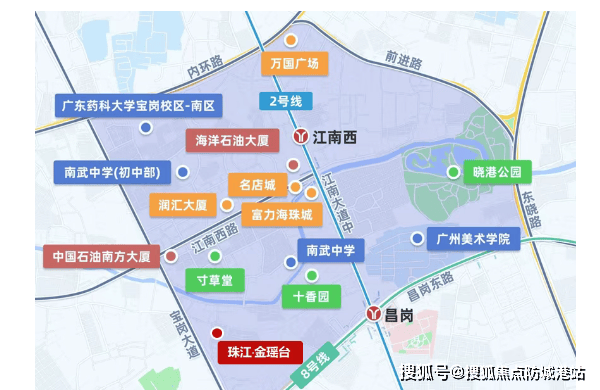 项目交通能级在老城区中堪称顶级。距离8号线宝岗大道站仅约280米(步行约4分钟),2号线江南西站约800米,双地铁覆盖,可快速通达珠江新城(约20分钟)、琶洲、广州南站等核心枢纽。自驾方面,地处宝岗大道黄金走廊,东接江南大道,西连工业大道,18分钟内可抵达珠江新城CBD;周边“三横三纵”路网密集,辅以四桥一隧道连接天河、越秀,通勤效率极高。公交线路亦四通八达,日常出行极为便捷。这种“地铁上盖+主干道环绕”的立体交通体系,让业主既能享受老城烟火气,又不失都市核心资源的高效链接。