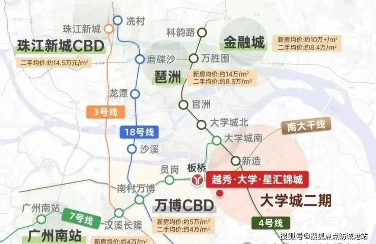 越秀·大学·星汇城地处琶洲以南,靠近地铁4号线新造站,距离仅约1.6公里,步行可接受范围内。此外,通过南大干线驾车前往万博CBD只需10分钟,而到达琶洲和珠江新城也仅需30分钟左右。项目周边还规划有滨江公园等大型绿地,为居民提供了良好的生活环境。