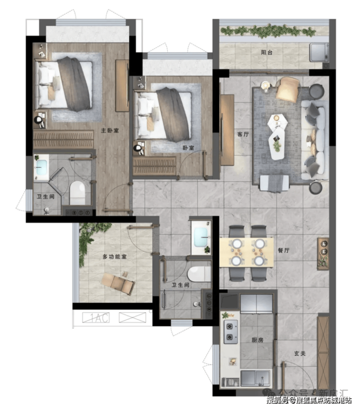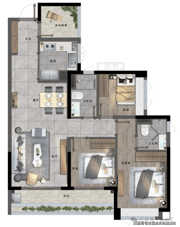 建面约90㎡的三房户型,南北对流,空气流通顺畅,有效提升了室内的空气质量。客厅开间约3.6米,空间宽敞明亮,一家人在此欢聚也不会感到拥挤。同时,该户型还带入户玄关,增加了收纳空间,让家居环境更加整洁有序。