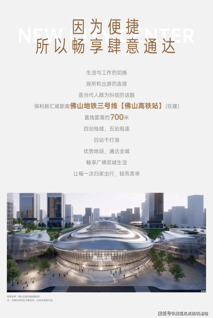 保利新汇城距离未来的地铁3/5/7/15号线地铁口仅650米,通过这些线路可以快速到达桂城、佛山西、狮山等重要区域。此外,四横四纵的公路网络使得从项目出发约4公里即可抵达祖庙,约7公里可达千灯湖和佛山西站,高速直抵广州也仅需约30公里。特别是广湛高铁佛山站的建设,将实现约10分钟无缝对接广州站,30分钟直达白云机场,90分钟可达湛江。