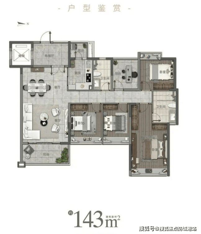 建筑面积约143平方米五房,采用1梯2户尊崇配置,东南向瞰中心园林与山湖盛景。